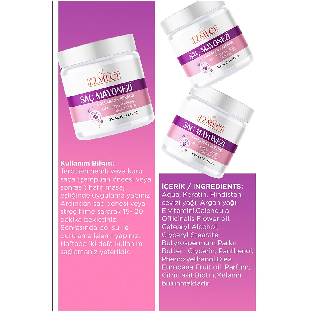 المكونات: ماء، كيراتين، مايونيز، زيت جوز الهند، زيت الأرجان، فيتامين هـ، زيت زهرة آذريون أوفيسيناليس، كحول سيتيل، ستيرات الجلسرين، زبدة بوتيروسبيرموم باركي، جلسرين، بانثينول، فينوكسي إيثانول، زيت فاكهة أوليا يوروبيا، عطر، حمض الستريك، البيوتين، الميلانين.