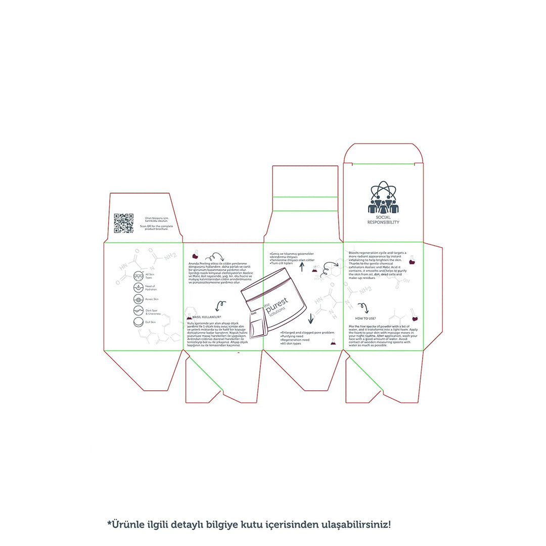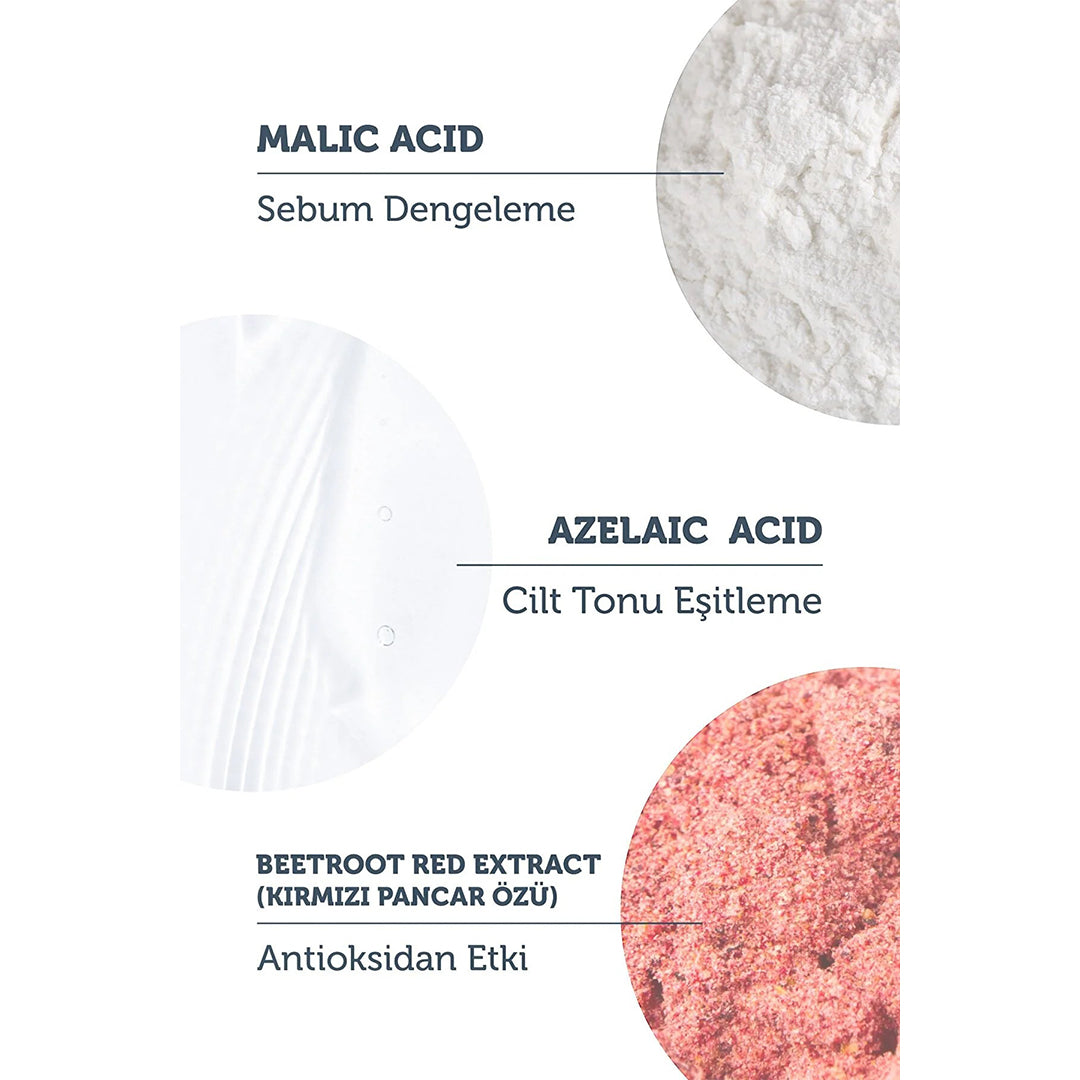 فوائد البودرة: ينعم البشرة بوجود مقشرات كيميائية لطيفة وحمض الأزيليك والماليك.